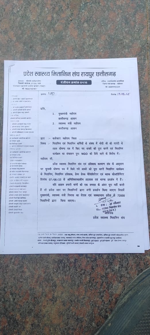 नयाभारत कोरबा मितानिन स्वास्थ्य कार्यक्रम के अंतर्गत आज दिनांक 19 अगस्त 2025 मंगलवार को घंटाघर चौक से लगभग 2250 की संख्या में उपस्थित होकर मितानिन आशा,मितानिन प्रशिक्षक, हेल्थ फैसिलिटेटर ,ब्लॉक समन्वक आदि कर्मचारियों के द्वारा दोपहर 12 बजे रैली निकालकर जिला कलेक्टर में अपने तीन सूत्रीय मांगों को लेकर ज्ञापन सौपा गया इसके पूर्व छत्तीसगढ़ की स्वास्थ्य सेवाओं की रीढ़ माने जाने वाले मितानिन आशा व संबंधित कर्मचारी गण विगत माह 29 जुलाई को एक दिवसीय प्रदेश स्तरीय धरना प्रदर्शन के द्वारा रायपुर में छत्तीसगढ़ के मुख्यमंत्री विष्णु देव साय को ज्ञापन सौपा जिसमें संगठन द्वारा उचित निराकरण हेतु 08 दिनों का पर्याप्त समय दिया गया यह की चुनावी माहौल में भारतीय जनता पार्टी के चुनावी वादों 2023 में मोदी जी के गारंटी में इस विषय का उचित स्थाई समाधान का संकल्प किया गया किंतु आज इन्हें कम पढ़ा लिखा समझकर सत्र 2002 के अनुसार जारी ठेका पद्धति के अनुसार पुनः दिल्ली के एनजीओ को ठेका देकर इसे कार्य करवाए जाने के फैसले पर अडिग रहने के कारण प्रदेश स्तरीय संगठन द्वारा 07 अगस्त लगातार 13 दिनों से अपने भविष्य को लेकर चिंतित सभी प्रभावित कर्मचारी गण क्रमशः संभाग स्तरीय धरना प्रदर्शन स्थल तूता रायपुर में बारी-बारी से सम्मिलित हुए जिसके अंतर्गत कोरबा जिला की सहभागिता रक्षाबंधन पर्व के दिन 09 अगस्त को रही साथ में उस दिन देश के प्रधानमंत्री नरेंद्र मोदी को मितानिन पाती के माध्यम से प्रदेश भर से अपनी मांगों का ध्यानाकर्षण हेतु अंतर्देशीय पत्र कार्ड के माध्यम से चिट्ठी भेजी गई किंतु वर्तमान में कोई सार्थक पहल नहीं हो पाने के कारण आज पुनः अपनी तीन सूत्रीय मांगों को लेकर ऊर्जा धनी कोरबा में भव्य रूप से रैली प्रदर्शन करके जिला कलेक्ट्रेट में अपने प्रतिनिधियों के माध्यम से उपस्थित कर्मचारियों को ज्ञापन सौंपा गया है अब देखना यह है की कितने दिनों में इस विषय का उचित निराकरण हो पता है अन्यथा इस बदलते हुए वातावरण में लोगों की तबीयत खराब हो रही है और स्वास्थ्य सुविधाओं में इनके कार्य न करने से कितना प्रभाव पड़ेगा ।