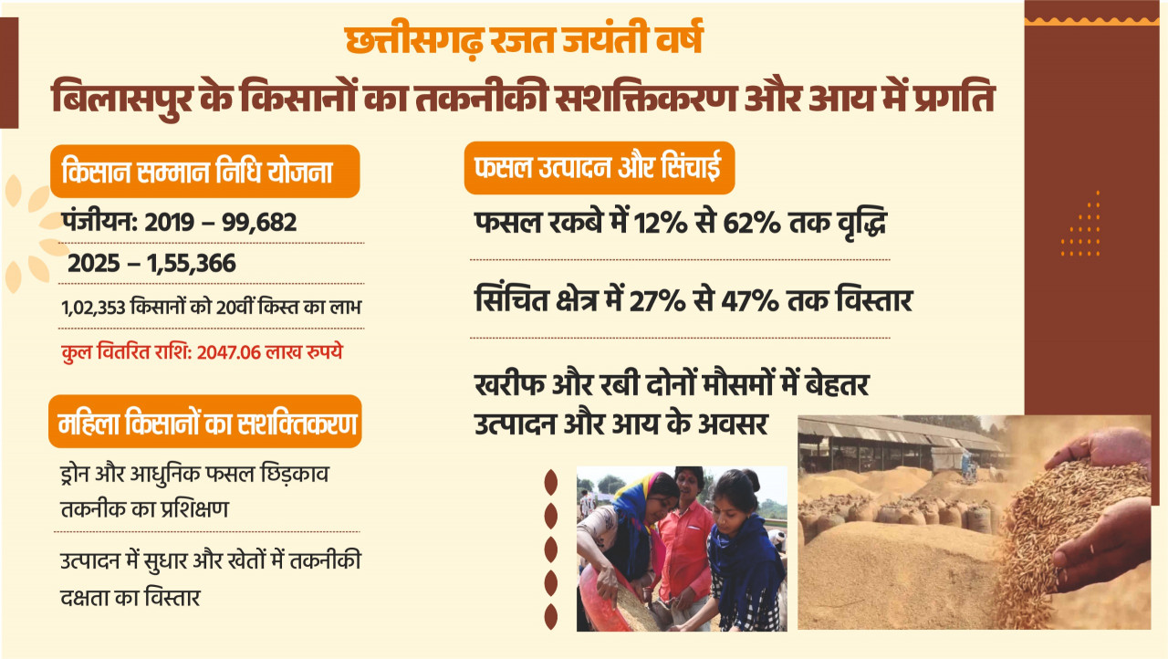 छत्तीसगढ़ रजत जयंती वर्ष में कृषि योजनाओं का प्रभावी क्रियान्वयन, तकनीकी प्रशिक्षण और किसानों की सक्रिय भागीदारी बिलासपुर जिले को कृषि विकास के मार्ग पर मजबूती से आगे ले जा रही है और किसानों की आर्थिक स्थिति को सुदृढ़ बना रही है।