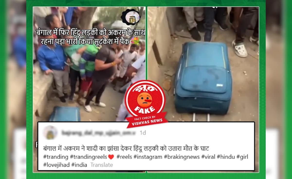 पश्चिम बंगाल से जोड़कर सोशल मीडिया पर एक वीडियो वायरल हो रहा है. इसमें एक सूटकेस में महिला के शव को देखा जा सकता है, जबकि उसके आसपास कई लोग खड़े हैं. कुछ यूजर्स इस वीडियो को शेयर कर दावा कर रहे हैं कि पश्चिम बंगाल में मुस्लिम शख्स ने हिंदू युवती की शादी का झांसा देकर हत्या कर दी.
