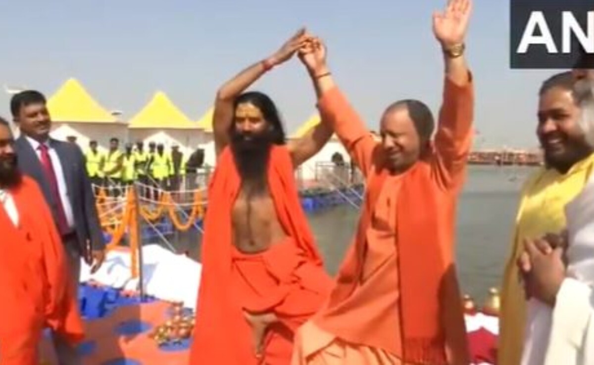 #WATCH | Uttar Pradesh CM Yogi Adityanath and Yog guru Baba Ramdev perform a Yoga pose at #MahaKumbh2025 in Prayagraj pic.twitter.com/p66bnH2tby