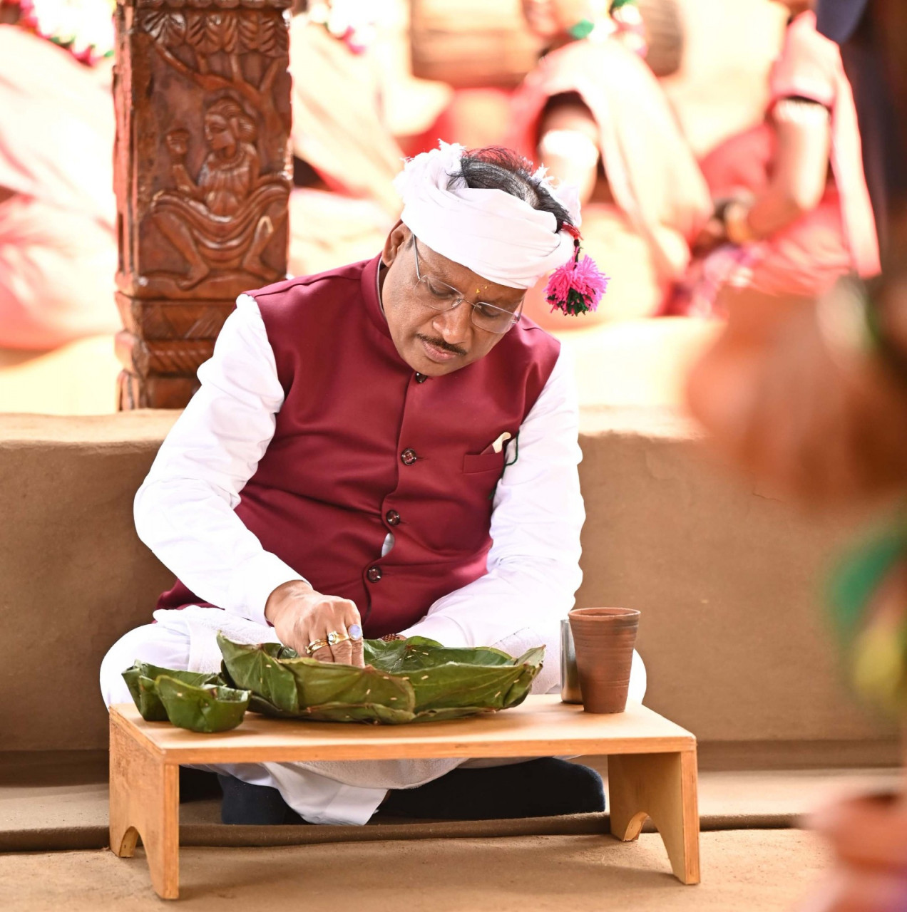 मुख्यमंत्री श्री साय ने घोटुल परिसर के लेय्योर एवं लेयोस्क कुरमा: युवाओं और युवतियों के लिए निर्मित कक्षों के साथ ही बिडार कुरमा: पारंपरिक वेशभूषा, प्राचीन वाद्ययंत्र एवं सांस्कृतिक सामग्रियों का संग्रह का निरीक्षण किया। इस दौरान ग्रामीणों की आग्रह पर मुख्यमंत्री श्री साय ने सगा कुरमा में बस्तर के पारंपरिक व्यंजनों का स्वाद लेकर क्षेत्र की खान-पान संस्कृति का सम्मान किया। इस दौरान मुख्यमंत्री के भोजन में विशेष रूप से भोजन गाटो-भात, कोदो-भात, उड़िद दार, हिरुवा दार, जीरा भाजी, कनकी पेज, भाजी घिरोल फुल, चाटी भाजी, कांदा भाजी, मुनगा भाजी, इमली आमट, मड़िया पेज, टमाटर चटनी, चिला रोटी, रागी कुरमा, रागी केक, रागी लट्टू, रागी जलेबी परोसा गया।