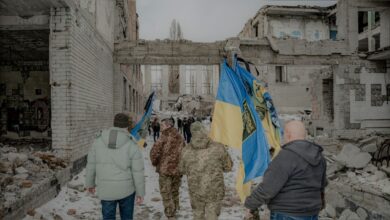 खार्किव में घातक बम विस्फोटों की बरसी पर यूक्रेनी सैनिकों की याद में सैनिक और शहीद के रिश्तेदार राष्ट्रीय ध्वज…
