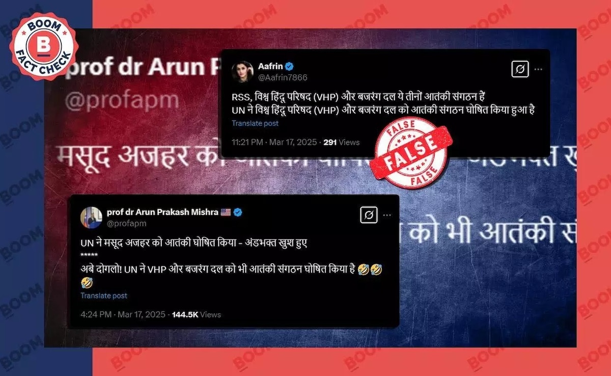 भारतीय दक्षिणपंथी संगठन विश्व हिंदू परिषद और बजरंग दल को लेकर सोशल मीडिया पर दावा किया जा रहा कि संयुक्त राष्ट्र संघ ने इन्हें आतंकवादी संगठन घोषित कर दिया है. बूम ने पाया कि यूएन ने विश्व हिंदू परिषद और बजरंग दल को आतंकी संगठन की सूची में कभी शामिल नहीं किया. यूएन सुरक्षा परिषद की आतंकवादी संगठनों के नाम वाली सूची में इन संगठनों के नाम नहीं है. यूएन ने मई 2019 में जैश-ए-मोहम्मद के मुखिया मसूद अजहर को वैश्विक आतंकवादी घोषित किया था. हालांकि अमेरिका की सेंट्रल इंटेलिजेंस एजेंसी (सीआईए) ने 2018 में अपनी ‘वर्ल्ड फैक्टबुक’ में वीएचपी और बजरंग दल को ‘धार्मिक उग्रवादी संगठन’ के रूप में वर्गीकृत किया था, जिसे बाद में सीआईए ने अपनी इस लिस्ट से हटा दिया था.